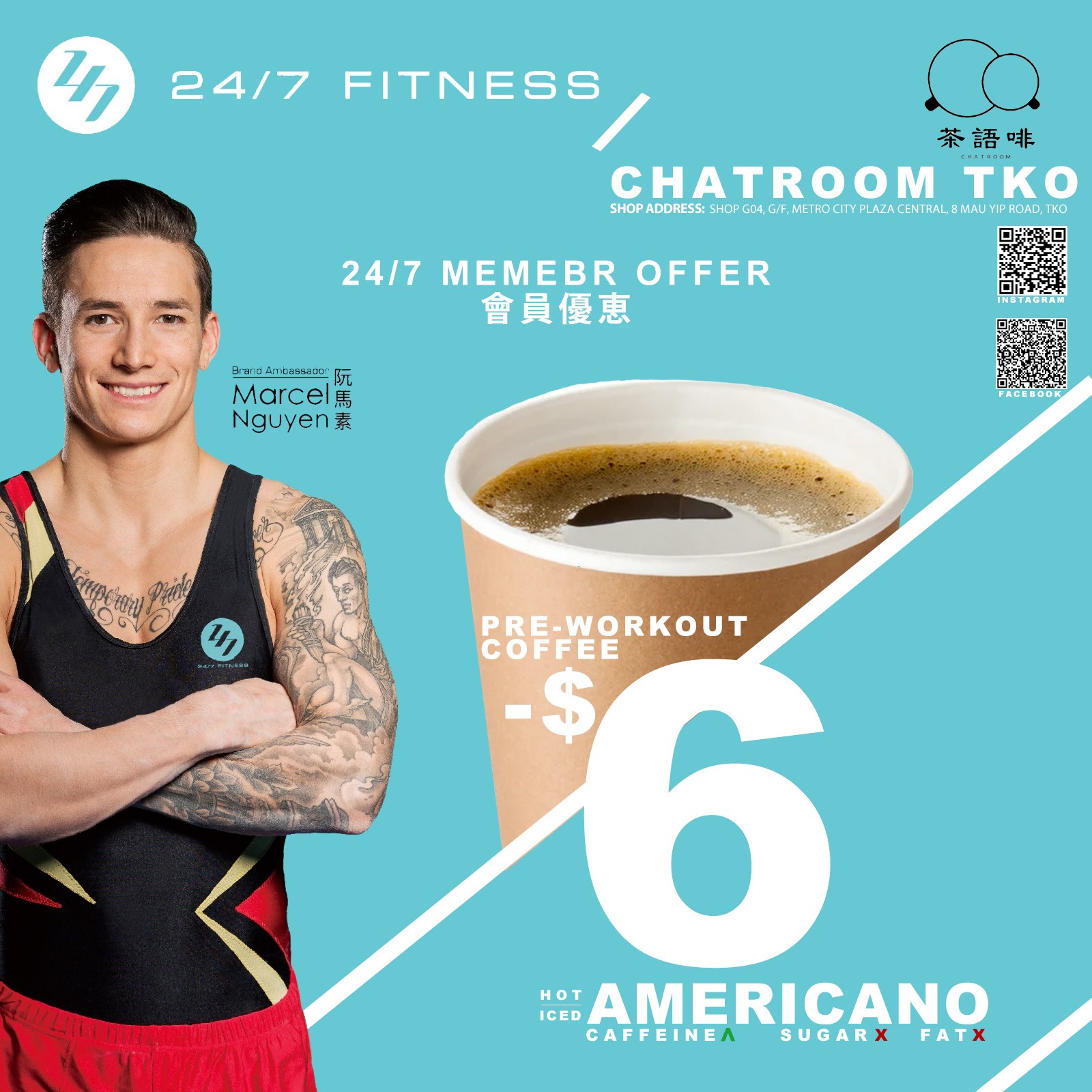 - 24/7 fitness members can enjoy -$6 discount off the original price of Chatroom Hot Americano & Iced Americano.