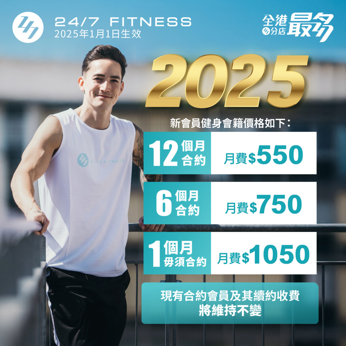 24/7 FITNESS 一直積極提升店舖環境及引入頂級健身器械,務求提供最優質的健身服務給各位會員,有見物價及營運成本按年不斷上漲,我哋決定於2025年1月1日起調整新加入會員嘅健身會籍價格,現有合約會員收費將維持不變,價格調整如下: